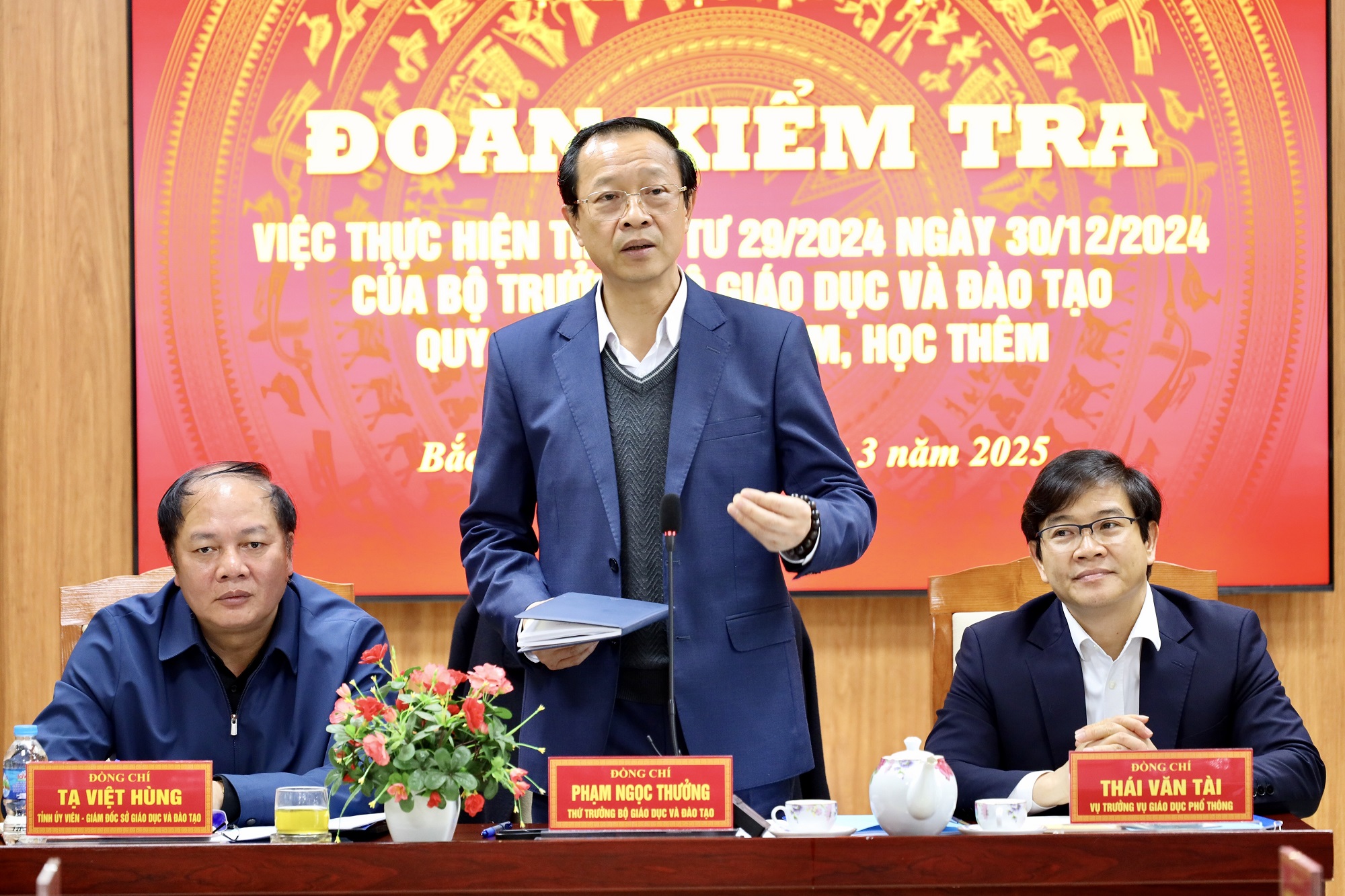 Phát biểu tại buổi làm việc, Thứ trưởng Bộ GDĐT Phạm Ngọc Thưởng đánh giá cao tinh thần chủ động, cách thức triển khai bài bản, nhẹ nhàng, nghiêm túc, hiệu quả Thông tư 29 của ngành Giáo dục Bắc Giang, đặc biệt là việc triển khai nghiêm, chặt từ cấp cơ sở. Thứ trưởng cũng chia sẻ vui mừng khi phụ huynh, đội ngũ hiệu trưởng ở Bắc Giang nhận thức đúng, thấu hiểu đúng nguyên lý của giáo dục để tâm huyết, trách nhiệm, phối hợp trong thực hiện Thông tư 29.