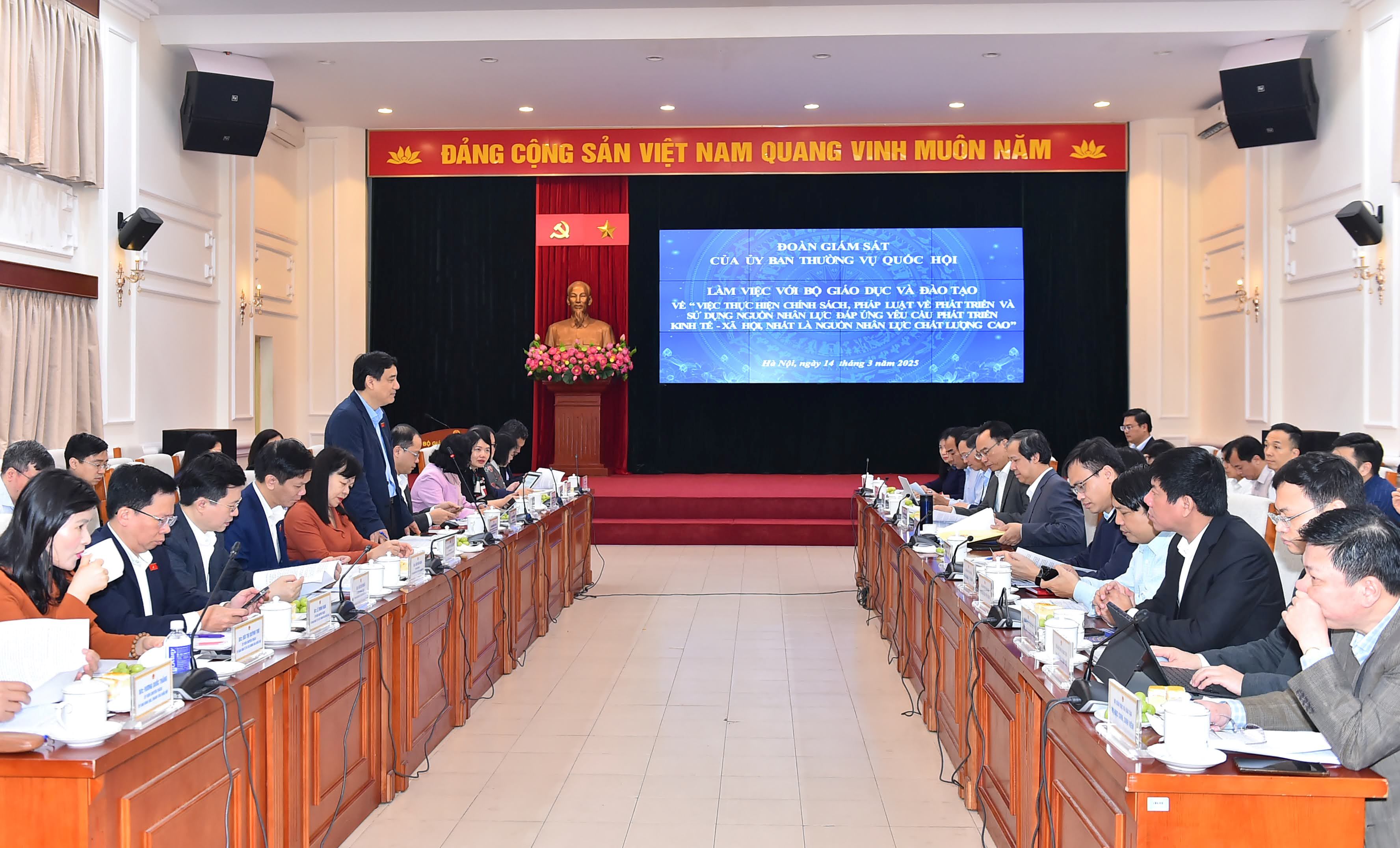 Phát biểu mở đầu, Chủ nhiệm Ủy ban Văn hóa và Xã hội của Quốc hội Nguyễn Đắc Vinh chia sẻ một số vấn đề đoàn giám sát quan tâm; trọng tâm là báo cáo về việc thực hiện chính sách, pháp luật về phát triển và sử dụng nguồn nhân lực đáp ứng yêu cầu phát triển kinh tế - xã hội, nhất là nguồn nhân lực chất lượng cao giai đoạn 2021-2024 do Bộ GDĐT xây dựng. Trong đó có nội dung về chủ trương, chính sách của Đảng liên quan đến phát triển, sử dụng nguồn nhân lực; việc thể chế hóa chủ trương này; đánh giá thực trạng, kết quả thực hiện chính sách…