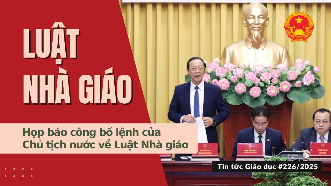 Chủ nhật, 13/07/2025 | 00:00 A- A A+ | TTGD số 226/2025| Họp báo công bố lệnh của Chủ tịch nước về Luật Nhà giáo Sáng 11/7, Văn phòng Chủ tịch nước tổ chức Họp báo công bố lệnh của Chủ tịch nước công bố các luật được Quốc hội khóa XV thông qua tại Kỳ họp thứ 9, trong đó có Luật Nhà giáo. moet.gov.vn Tin cùng chuyên mục TTGD số 226/2025| Họp báo công bố lệnh của Chủ tịch nước về Luật Nhà giáo Bộ GDĐT làm việc với Ủy ban Văn hóa và Xã hội về hai dự thảo Luật TTGD số 225/2025| Ký kết phối hợp giữa Ban Tuyên giáo và Dân vận Trung ương và Đảng uỷ Bộ GDĐT Bế mạc tập huấn giảng dạy môn học Giáo dục quốc phòng và an ninh năm 2025 TTGD số 224/2025| Việt Nam – Palestine kí kết thỏa thuận hợp tác giáo dục giai đoạn 2025–2030 Luật Nhà giáo: Tôn vinh sự cống hiến, nâng cao trách nhiệm nghề nghiệp TTGD số 223/2025| Khai thông nguồn lực, tạo không gian phát triển bền vững cho giáo dục đại học TTGD số 222/2025| Thứ trưởng Thường trực Phạm Ngọc Thưởng làm việc với UNESCO Việt Nam Ký kết chương trình phối hợp giữa Ban Tuyên giáo và Dân vận Trung ương và Đảng uỷ Bộ GDĐT giai đoạn 2025 – 2030 Bộ trưởng Nguyễn Kim Sơn tiếp xúc cử tri sau Kỳ họp thứ 9, Quốc hội khoá XV