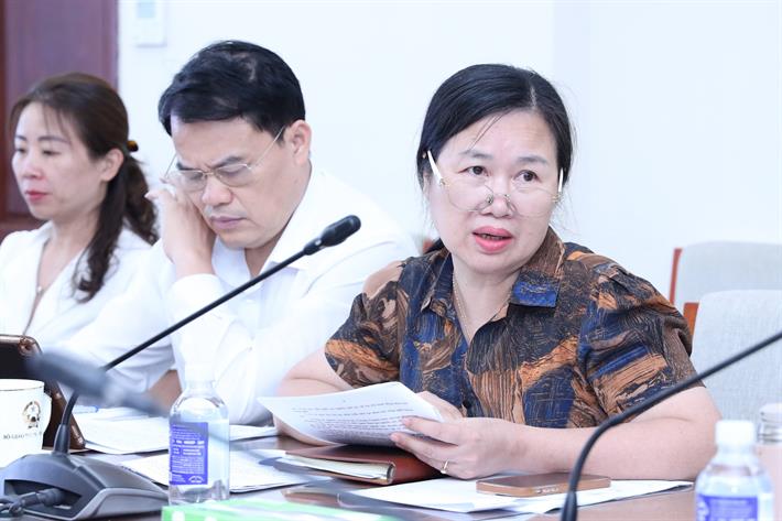 Phó Cục trưởng Cục Nhà giáo và Cán bộ quản lý giáo dục Lê Thị Thanh Nhàn trao đổi tại cuộc họp