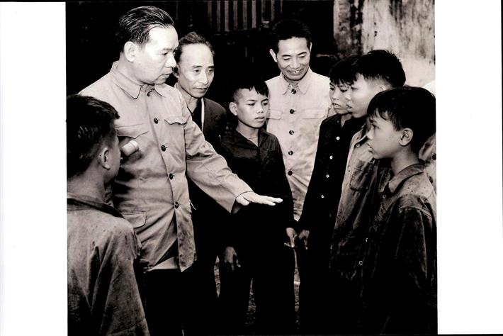 Bộ trưởng Bộ Giáo dục Nguyễn Văn Huyên thăm hỏi các em học sinh trường Thuỵ Dân (Thái Bình) sống sót sau trận ném bom của giặc Mỹ ngày 21/10/1966
