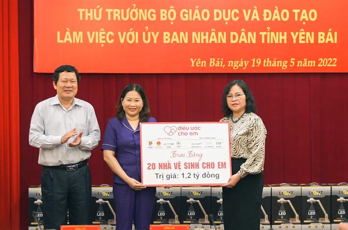 Thứ trưởng Ngô Thị Minh trao quà tặng từ chương trình "Điều ước cho em - kết nối nguồn lực xã hội xây dựng trường học an toàn, thân thiện cho trẻ em, học sinh giai đoạn 2021-2025", cho trường học tỉnh Yên Bái