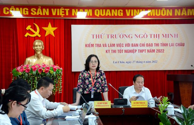 Thứ trưởng Ngô Thị Minh đề nghị, tỉnh Lai Châu chú trọng kiểm tra, rà soát về trách nhiệm của từng thành viên trong Ban chỉ đạo, từng thành viên trong Hội đồng thi, từng thành viên trong điểm thi để trách xảy ra sai sót, đảm bảo kỳ thi công bằng, khách quan, tạo niềm tin cho các em học sinh.
