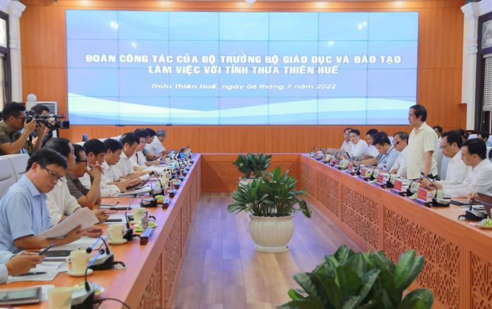 “Qua hơn 2 năm dịch bệnh, nhiều địa phương khó khăn về chuẩn bị điều kiện cơ sở vật chất, trang thiết bị dạy học, tỷ lệ học chay còn nhiều. Tỉnh Thừa Thiên Huế cần đặt ra nội dung công việc, cố gắng khai thác tối đa trang thiết bị trường học, tránh việc học sinh phải học chay. Mong địa phương quan tâm hỗ trợ ngành Giáo dục để việc đổi mới giáo dục phổ thông đảm bảo tốt”, Bộ trưởng nói.