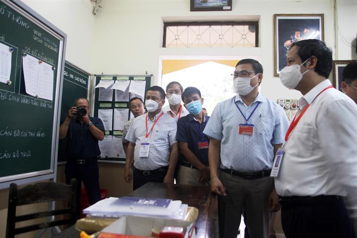 Tại Điểm thi Trường THPT Đặng Huy Trứ, Bộ trưởng Nguyễn Kim Sơn đã tới kiểm tra phòng Hội đồng, phòng Y tế, khu vực để đồ của thí sinh và gặp gỡ, động viên học sinh, giáo viên, lực lượng thanh niên tình nguyện tham gia kỳ thi.