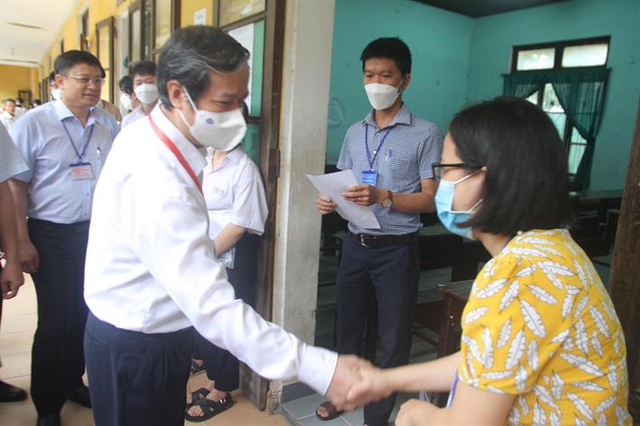 Bộ trưởng động viên giáo viên làm nhiệm vụ coi thi tại Điểm thi Trường THPT Đặng Huy Trứ