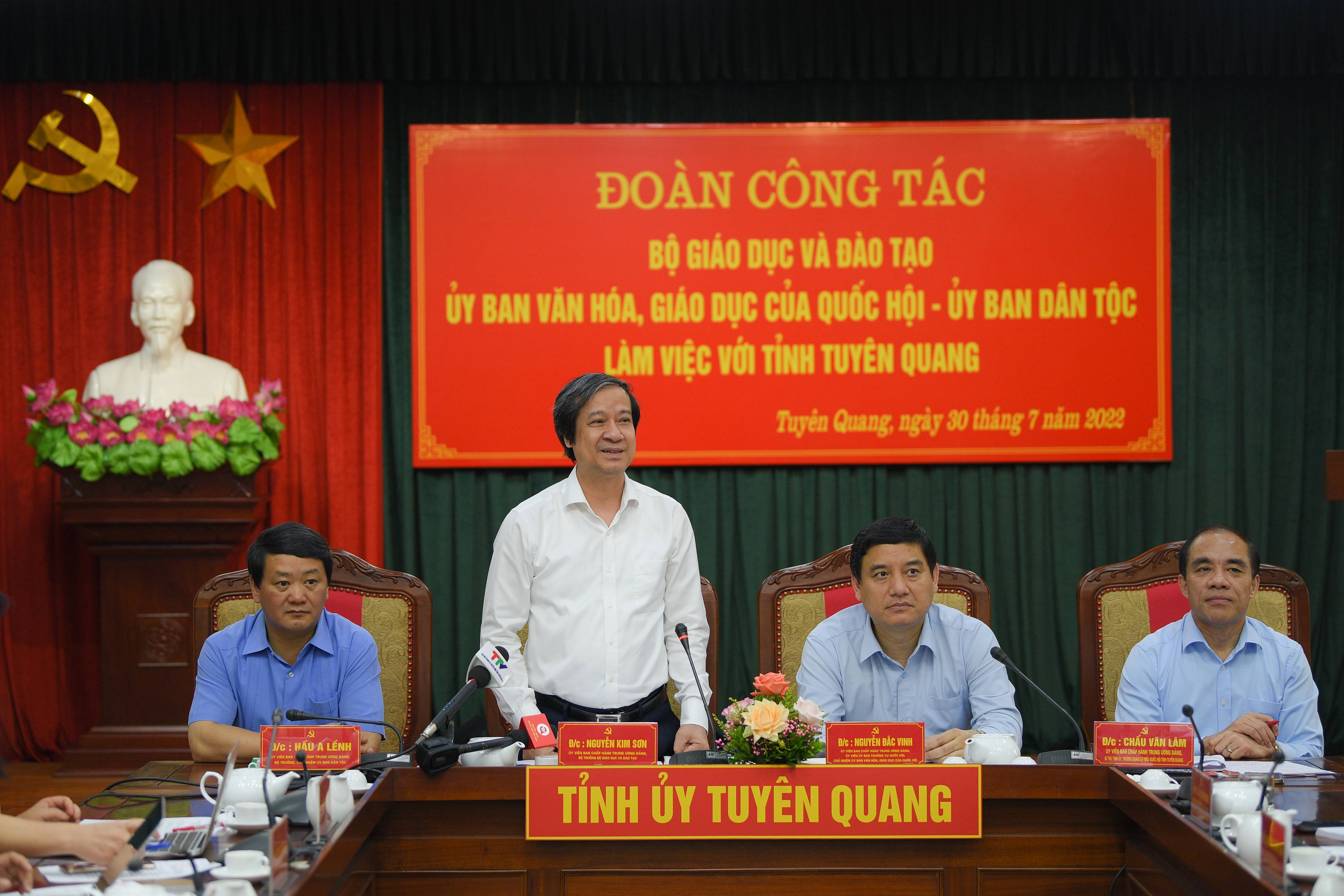 Phát biểu tại buổi làm việc, Bộ trưởng Nguyễn Kim Sơn nhấn mạnh vai trò quan trọng của công tác phối hợp, sự hô ứng giữa các bộ, ngành trong xây dựng chính sách, chỉ đạo các công việc liên quan đến giáo dục. Với địa bàn khu vực miền núi, có nhiều đồng bào dân tộc như Tuyên Quang, sự phối hợp này càng quan trọng, bởi giải quyết vấn đề giáo dục cần phải giải quyết nhiều vấn đề khác có liên quan.