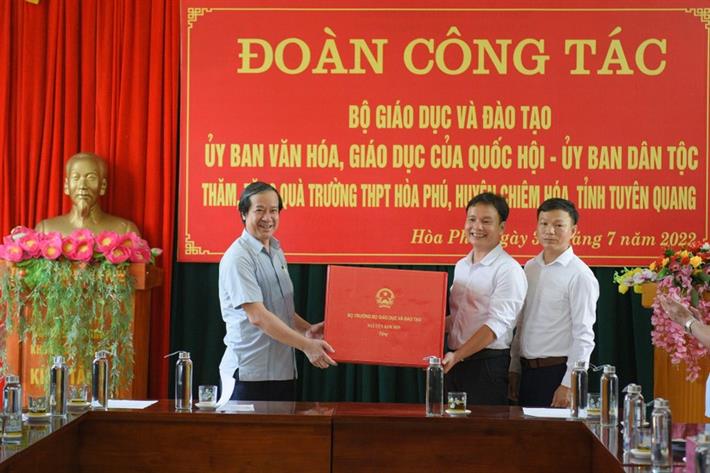 Tại mỗi trường: THPT Hòa Phú, THCS Hòa Phú, Bộ trưởng Nguyễn Kim Sơn tặng quà lưu niệm gồm sách, tranh và một bộ máy vi tính. Bộ trưởng, Chủ nhiệm Ủy ban Dân tộc Hầu A Lềnh tặng mỗi trường 100 suất quà cho học sinh khó khăn, mỗi suất trị giá 500 ngàn đồng. Bí thư Tỉnh ủy Chẩu Văn Lâm thay mặt Tỉnh ủy, Hội đồng nhân dân, Ủy ban nhân dân tỉnh Tuyên Quang tặng 2 trường, mỗi trường một bộ máy vi tính.