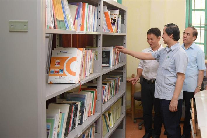 Bộ trưởng Nguyễn Kim Sơn thăm phòng thư viện tại Trường THPT Hòa Phú