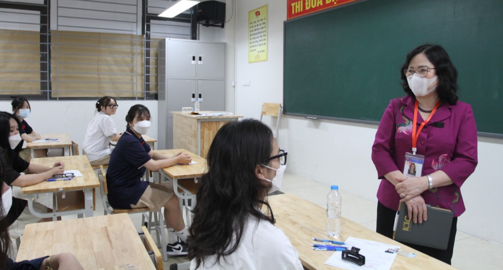 Sáng 7/7, Đoàn kiểm tra số 5 của Ban chỉ đạo cấp quốc gia Kỳ thi tốt nghiệp THPT năm 2022 do Thứ trưởng Ngô Thị Minh làm trưởng đoàn đã tới kiểm tra công tác coi thi tại một số điểm thi của thành phố Hà Nội.