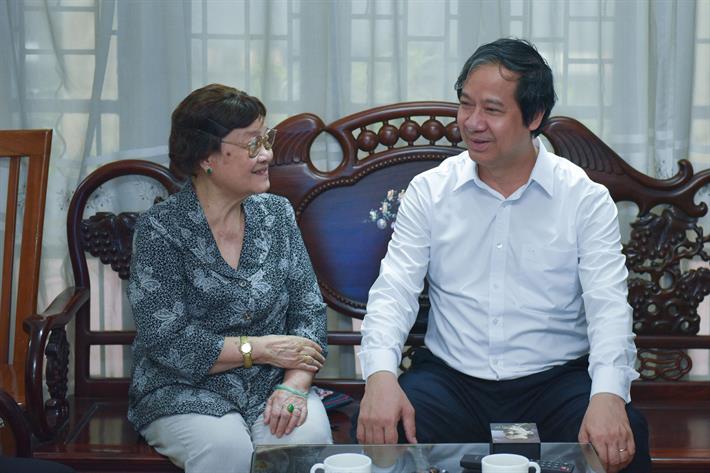 Bộ trưởng Nguyễn Kim Sơn hỏi thăm sức khỏe bà Nguyễn Thu Nhạn, vợ cố Giáo sư Nguyễn Đình Tứ