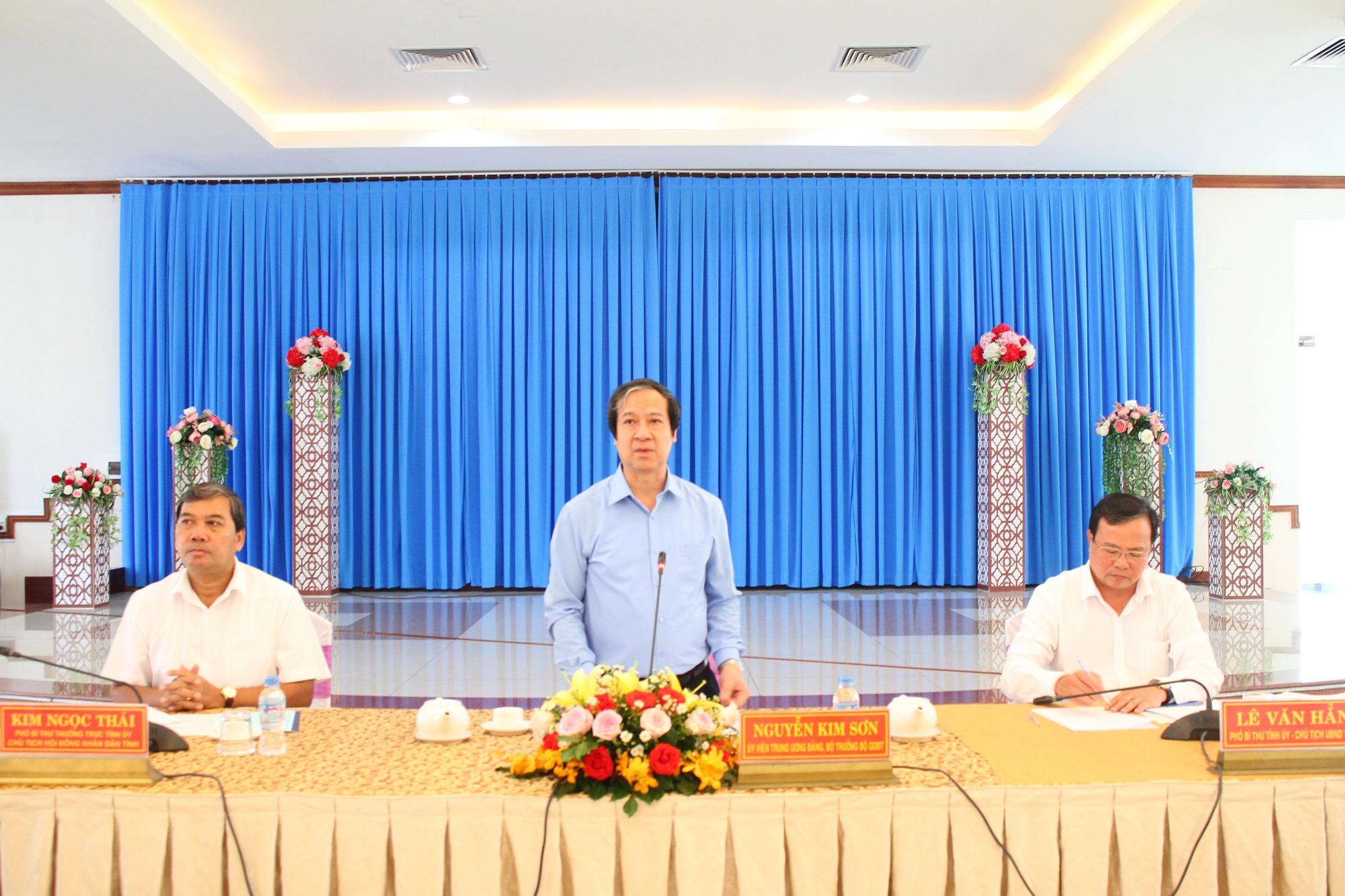 Phát biểu tại buổi làm việc, Bộ trưởng Nguyễn Kim Sơn ghi nhận, đánh giá cao những nỗ lực, kết quả của giáo dục Trà Vinh. Dù là tỉnh còn nhiều khó khăn song kết quả giáo dục mầm non, giáo dục phổ thông thể hiện qua chỉ số huy động trẻ đến trường, chỉ số điểm thi tốt nghiệp THPT thuộc nhóm khá.