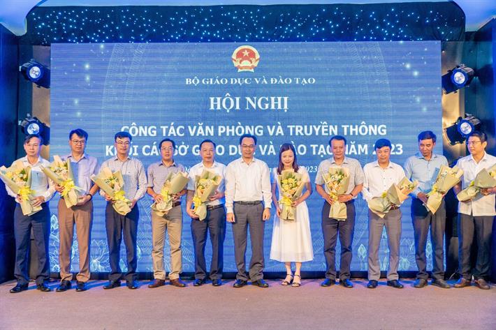 Tại hội nghị, Thứ trưởng Hoàng Minh Sơn thay mặt lãnh đạo Bộ GDĐT tặng hoa, chúc mừng các tân Chánh Văn phòng các Sở GDĐT vừa được bổ nhiệm trong năm học 2022-2023.