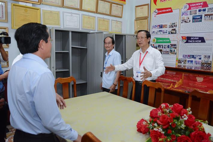 Thứ trưởng trao đổi về việc bố trí bảo quản bài thi, đề thi sao cho phù hợp, tránh nhầm lẫn, sai sót tại Điểm thi Trường THPT Hồ Thị Kỷ, Cà Mau