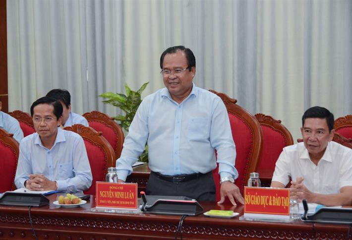 Phó Chủ tịch UBND tỉnh, Trưởng Ban Chỉ đạo thi tỉnh Cà Mau Nguyễn Minh Luân trao đổi tại buổi làm việc