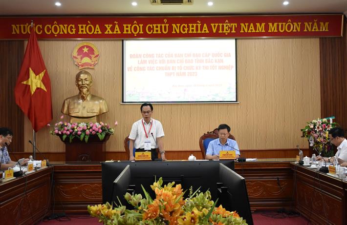 Báo cáo với Đoàn công tác, Giám đốc Sở GDĐT tỉnh Bắc Kạn Nguyễn Ngọc Sơn cho biết: Năm nay, tỉnh Bắc Kạn có tổng số 2.917 thí sinh đăng ký dự thi, trong đó có 251 thí sinh tự do, đăng ký tại 14 điểm thi với gần 1.500 nhân sự được huy động tham gia vào các khâu tổ chức kỳ thi.