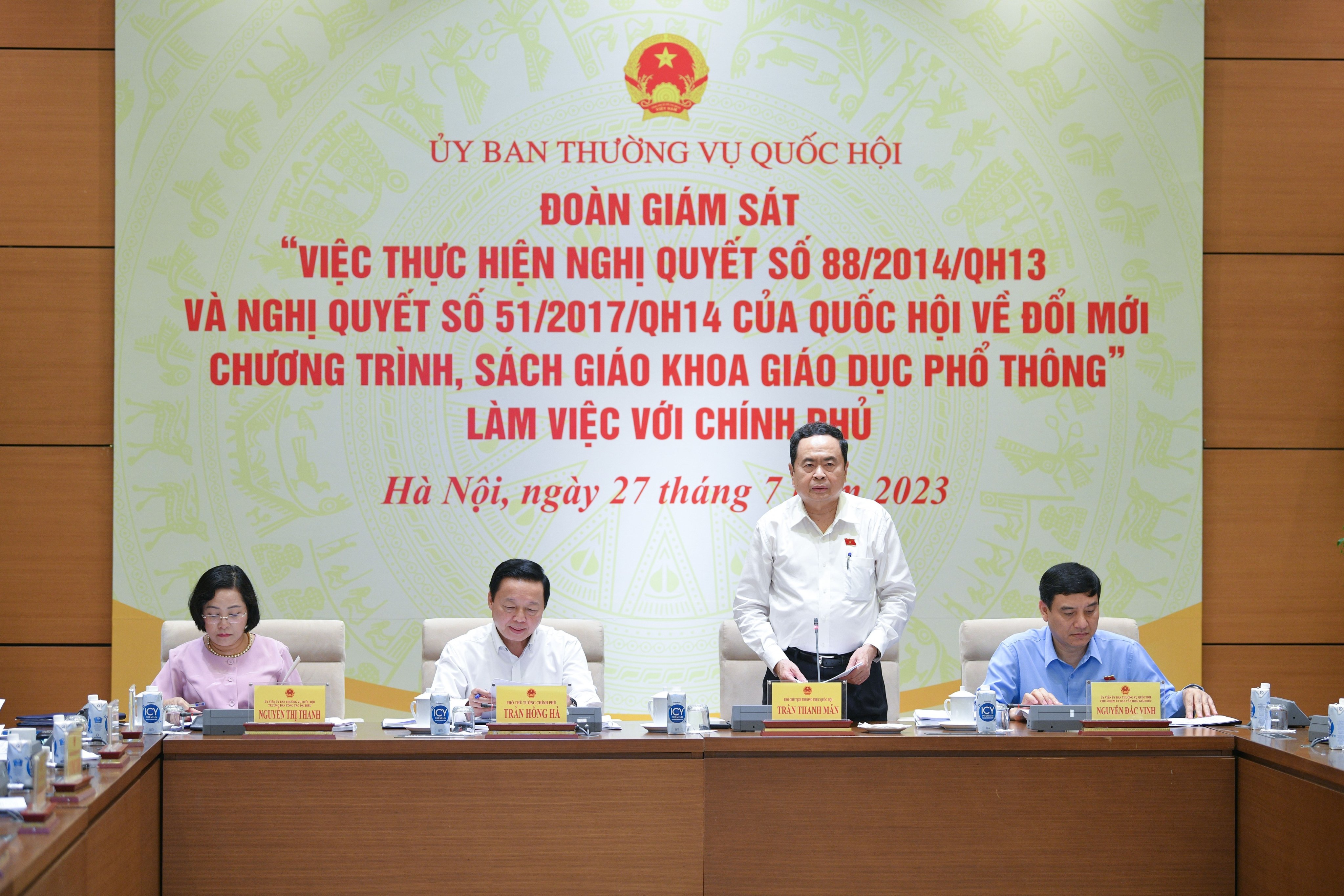 Kết luận buổi làm việc, Phó Chủ tịch Thường trực Quốc hội Trần Thanh Mẫn ghi nhận, đánh giá cao công tác chuẩn bị báo cáo, giải trình của Chính phủ và các Bộ liên quan về công tác lãnh đạo, chỉ đạo tổ chức thực hiện đổi mới chương trình, sách giáo khoa giáo dục phổ thông theo tinh thần của Nghị quyết số 88 và Nghị quyết số 51. Nội dung báo cáo, giải trình của các bộ, ngành cơ bản đáp ứng yêu cầu Đoàn giám sát đặt ra.
