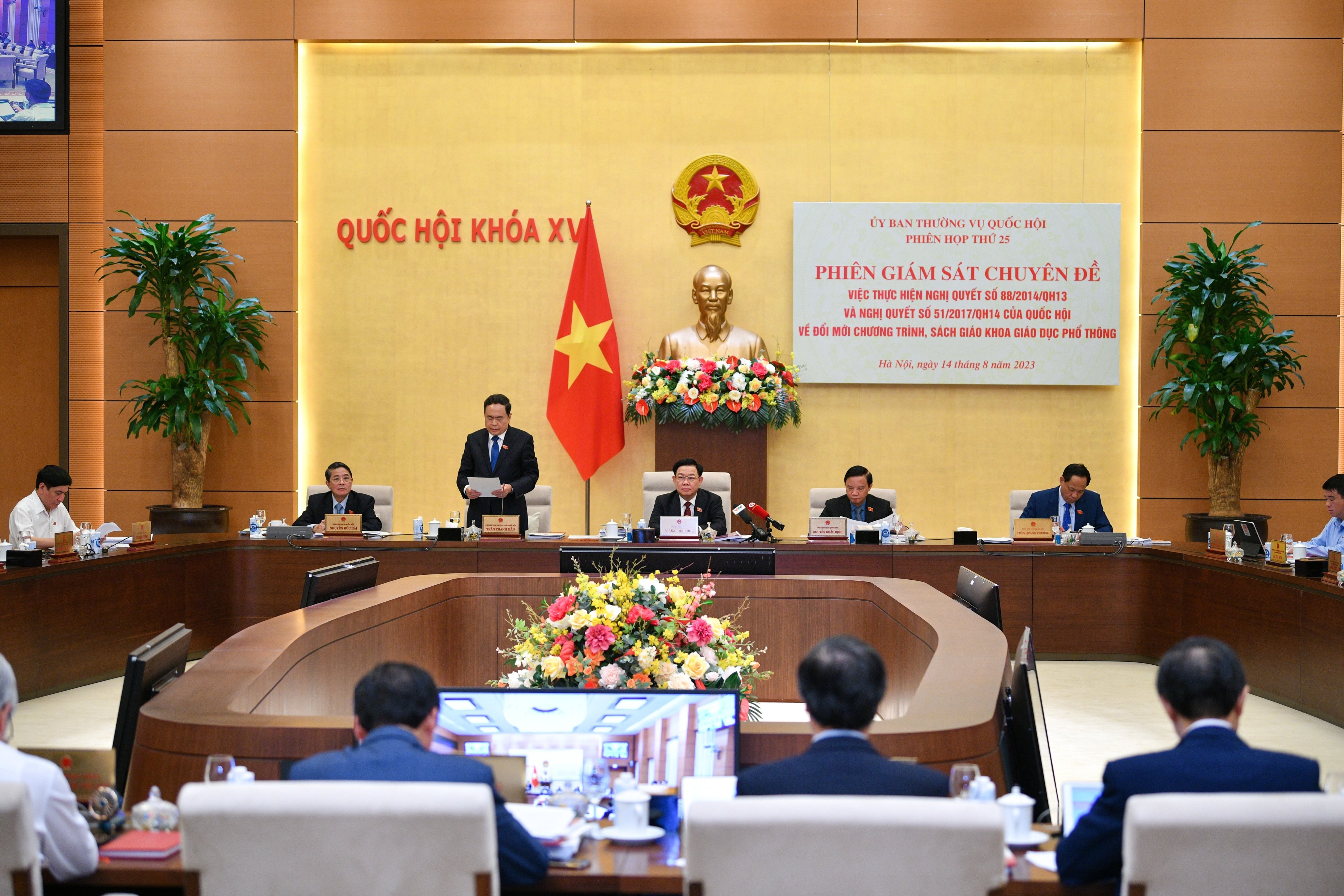 Báo cáo tóm tắt kết quả giám sát chuyên đề “Việc thực hiện Nghị quyết số 88/2014/QH13 và Nghị quyết số 51/2017/QH14 của Quốc hội về đổi mới chương trình, sách giáo khoa giáo dục phổ thông” do Chủ nhiệm Uỷ ban Văn hoá, Giáo dục Quốc hội Nguyễn Đắc Vinh - Phó trưởng Đoàn giám sát trình bày tại phiên họp đề cập trên 8 phương diện: Về việc ban hành văn bản quy phạm pháp luật, công tác chỉ đạo, hướng dẫn triển khai thực hiện; về đổi mới chương trình giáo dục phổ thông; về đổi mới phương pháp giáo dục và phương pháp đánh giá chất lượng giáo dục; về bảo đảm đội ngũ giáo viên; về biên soạn sách giáo khoa mới; về bảo đảm về cơ sở vật chất, thiết bị dạy học; về bảo đảm kinh phí; về công tác xã hội hóa.