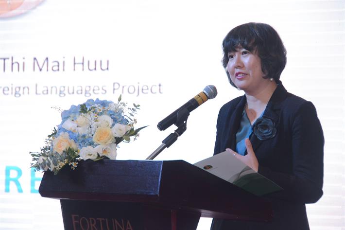 Bà Nguyễn Thị Mai Hữu, Giám đốc Đề án Ngoại ngữ Quốc gia trao đổi tại hội thảo