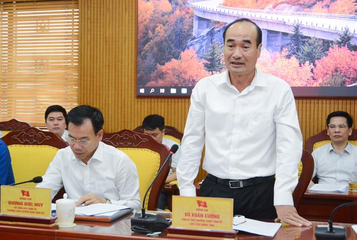 Phó Bí thư Thường trực Tỉnh uỷ, Chủ tịch Hội đồng nhân dân tỉnh Lào Cai Vũ Xuân Cường trao đổi tại buổi làm việc