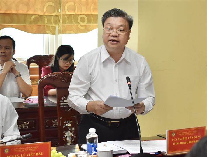 Hiệu trưởng Trường Đại học Hồng Đức Bùi Văn Dũng báo cáo tại buổi làm việc