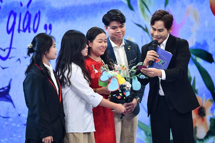 Cô giáo Đặng Thị Ngọc Hà (áo dài đỏ) và học trò trên sân khấu chương trình