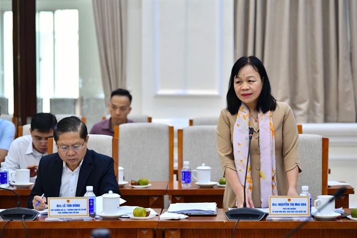 Phó Chủ nhiệm Ủy ban Văn hóa Giáo dục của Quốc hội Nguyễn Thị Mai Hoa trao đổi tại phiên họp