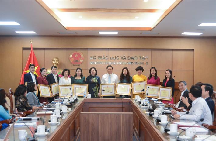 Thứ trưởng Ngô Thị Minh trao bằng khen của Bộ trưởng GDĐT cho tập thể, cá nhân có thành tích xuất sắc trong công tác vì sự tiến bộ của phụ nữ năm 2023