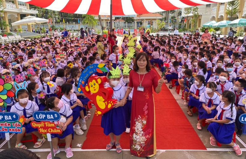Cô trò tiểu học TP Mỹ Tho (Tiền Giang) trong ngày khai giảng