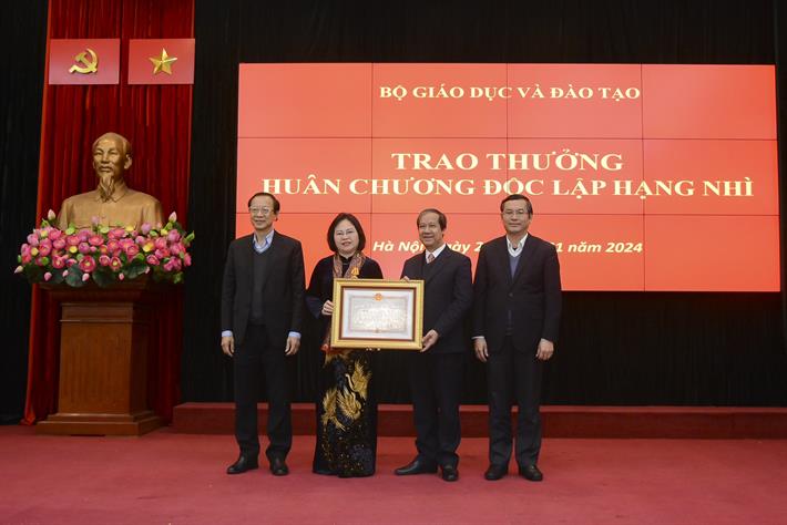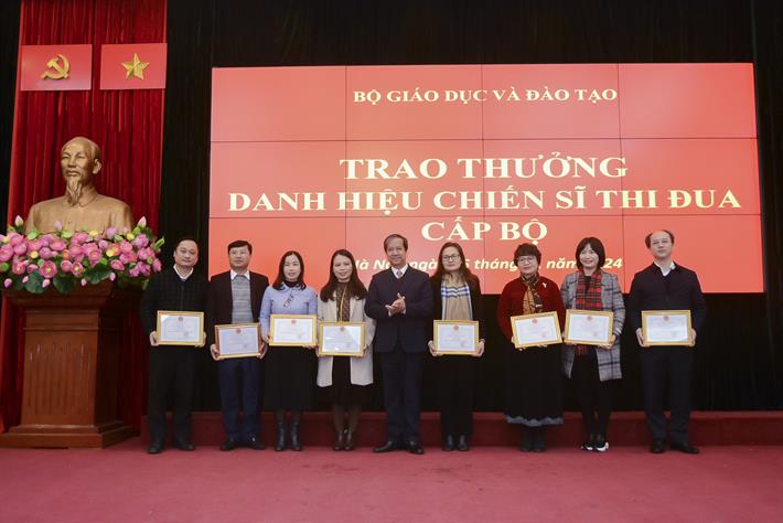 Hội nghị cũng công bố và trao quyết định tặng Cờ thi đua của Bộ GDĐT cho 5 tập thể; công nhận chiến sĩ thi đua cấp Bộ cho 9 cá nhân; tặng Bằng khen của Bộ trưởng cho 10 tập thể và 26 cá nhân hoàn thành xuất sắc nhiệm vụ công tác năm 2022-2023; tặng Bằng khen của Bộ trưởng cho 13 cá nhân có nhiều đóng góp cho sự nghiệp giáo dục.