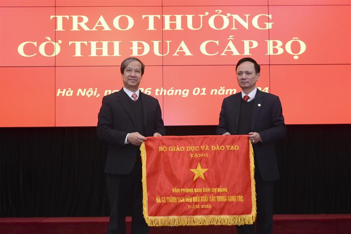 Bộ trưởng Nguyễn Kim Sơn trao cờ thi đua của Bộ GDĐT cho Văn phòng Ban Cán sự Đảng