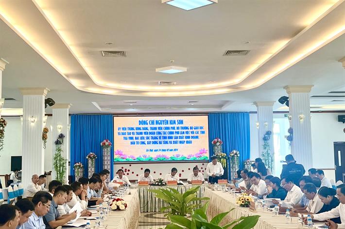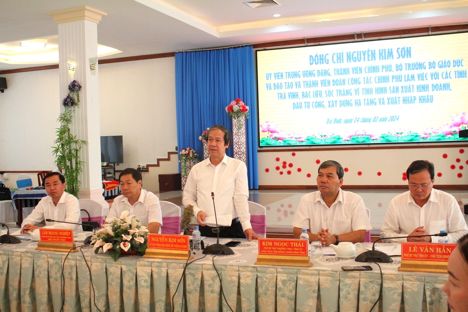 Phát biểu tại buổi làm việc, Bộ trưởng Nguyễn Kim Sơn chuyển lời của Thủ tướng Chính phủ gửi lời chúc năm mới tới lãnh đạo 3 tỉnh: Trà Vinh, Bạc Liêu, Sóc Trăng. Chúc cho 3 tỉnh đạt được nhiều thành tựu trong năm 2024, đặc biệt về sản xuất kinh doanh, xây dựng cơ sở hạ tầng, giải ngân đầu tư công và xuất nhập khẩu.