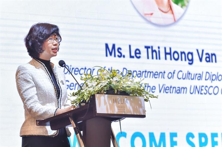 Bà Lê Thị Hồng Vân, Quyền Vụ trưởng, Vụ Ngoại giao Văn hóa và UNESCO, Tổng Thư ký Ủy ban Quốc gia UNESCO Việt Nam phát biểu tại Hội thảo