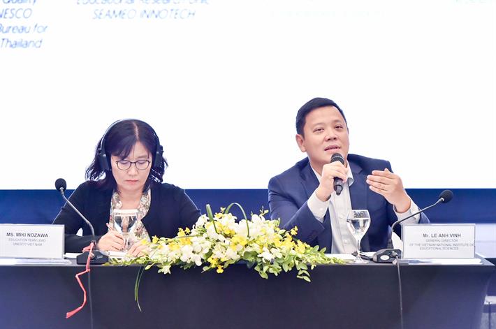 Viện trưởng Viện Khoa học Giáo dục Việt Nam Lê Anh Vinh và bà Miki Nozawa, Trưởng phòng Giáo dục, UNESCO Hà Nội chủ trì thảo luận mở tại Hội thảo