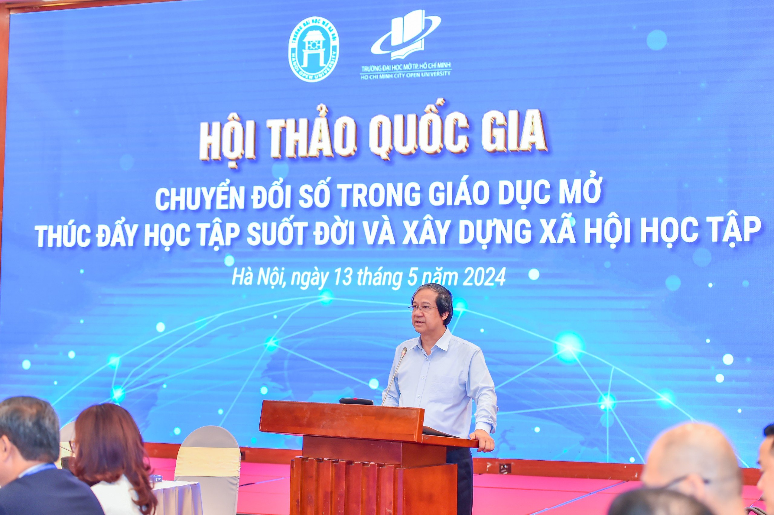 Đánh giá cao ý nghĩa của Hội thảo “Chuyển đổi số trong giáo dục mở thúc đẩy học tập suốt đời và xây dựng xã hội học tập” do 2 Trường Đại học Mở đồng tổ chức, Bộ trưởng cho rằng đây là diễn đàn để cùng trao đổi, thảo luận, chia sẻ kinh nghiệm, đề xuất các giải pháp, kiến nghị nhằm thúc đẩy mạnh mẽ, toàn diện công tác chuyển đổi số trong giáo dục đào tạo, tạo cơ hội học tập bình đẳng của người dân ở các vùng miền, thúc đẩy học tập suốt đời của xã hội và cá nhân. Đây cũng là dịp để các cơ quan quản lý nhìn nhận các vấn đề, thực trạng, các yêu cầu từ thực tiễn để làm cơ sở xây dựng các cơ chế, chính sách phù hợp.