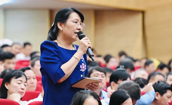 Giám đốc Sở GDĐT tỉnh Hậu Giang Nguyễn Hoài Thúy Hằng trao đổi tại hội nghị