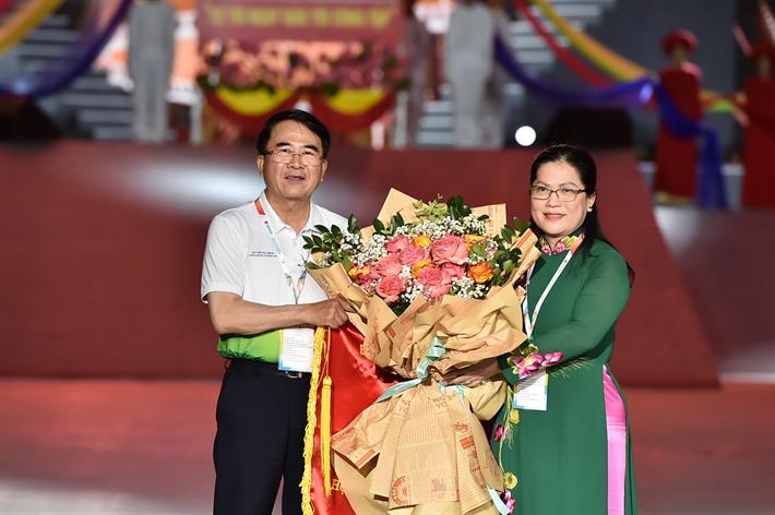 Thứ trưởng Nguyễn Thị Kim Chi trao cờ lưu niệm cho thành phố Hải Phòng - địa phương đăng cai Hội khỏe Phù Đổng toàn quốc