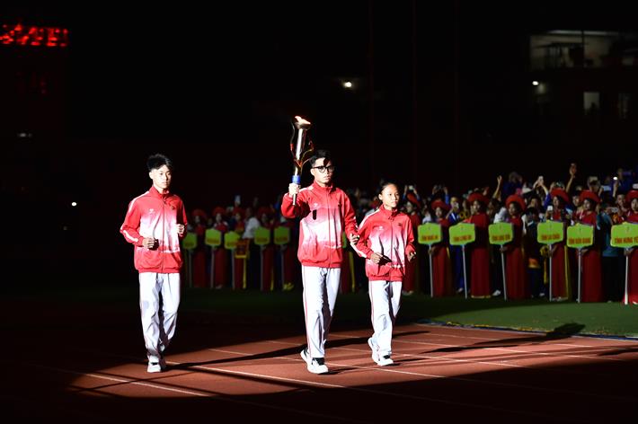 Phó Thủ tướng Lê Thành Long và đại diện Ban Tổ chức thực hiện nghi thức đón và chuyển ngọn đuốc Hội khoẻ Phù Đổng