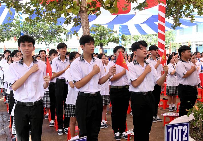 Học sinh Trường THPT Phạm Hùng, Vĩnh Long trong lễ chào cờ tại khai giảng năm học mới. Ảnh: Lâm Hiển