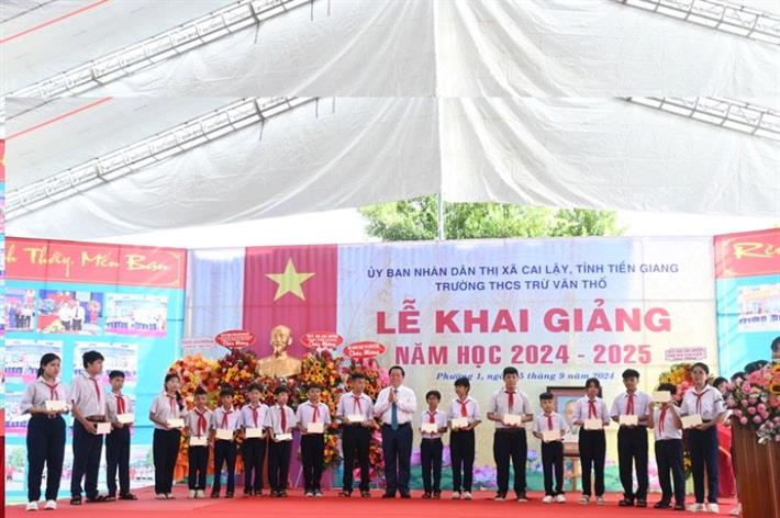 Nhân dịp này, Trưởng Ban Tuyên giáo Trung ương Nguyễn Trọng Nghĩa đã trao tặng 50 suất học bổng (mỗi suất giá trị 1 triệu đồng) và UBND tỉnh Tiền Giang trao 20 suất (mỗi suất 1 triệu đồng) cho các em học sinh đang học tại Trường THCS Trừ Văn Thố.