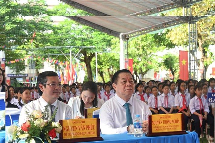 Trưởng Ban Tuyên giáo Trung ương Nguyễn Trọng Nghĩa và Thứ trưởng Bộ GDĐT Nguyễn Văn Phúc dự lễ khai giảng. Ảnh: Thành Nhân
