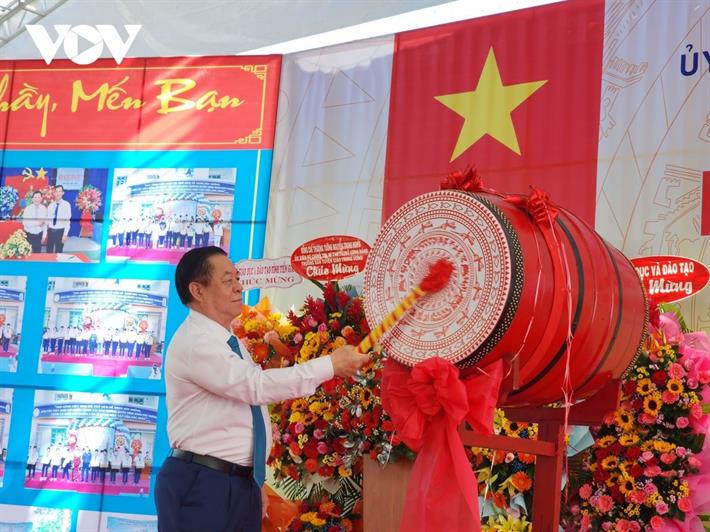 Trưởng Ban Tuyên giáo Trung ương đánh trống khai giảng năm học 2024-2025. Ảnh: VOV
