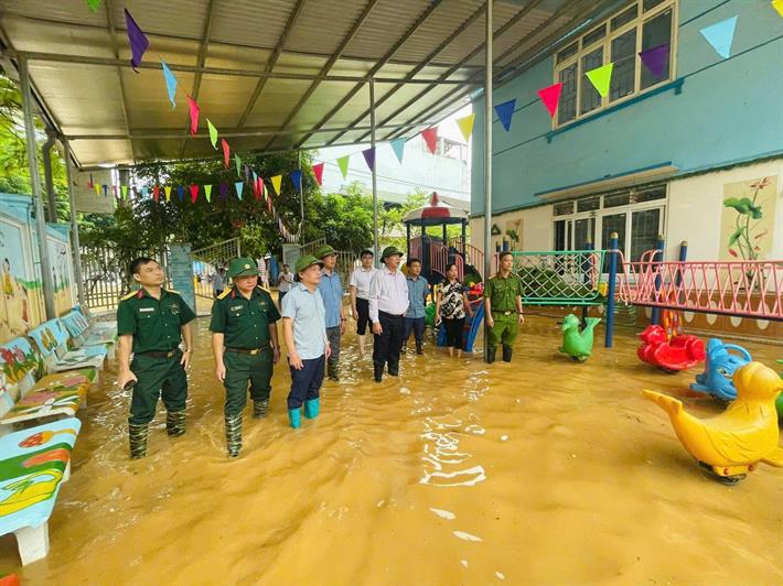 Ngay sau khi nước rút, UBND thành phố, Phòng GDĐT thành phố đã chỉ đạo huy động các lực lượng hỗ trợ nhà trường công tác vệ sinh khử khuẩn khuôn viên, sắp xếp đồ dùng, thiết bị trong nhà trường sau cơn lũ. Tính đến thời điểm hiện tại, nhà trường đã hoàn thành công tác khắc phục hậu quả sau lũ lụt, chuẩn bị tốt cơ sở vật chất, sẵn sàng đón trẻ quay trở lại trường học vào ngày 16/9.