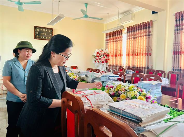 Thứ trưởng kiểm tra hồ sơ, sổ sách đã được thầy cô giáo Trưởng Tiểu học Nguyễn Thái Học bảo quản an toàn sau lũ