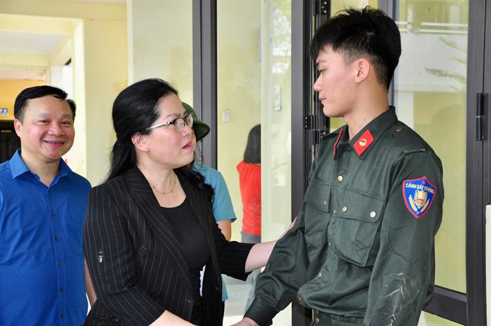 Thứ trưởng cảm ơn các chiến sĩ cảnh sát cơ động, Công an tỉnh Yên Bái đang hỗ trợ tại Trường Tiểu học Nguyễn Thái Học