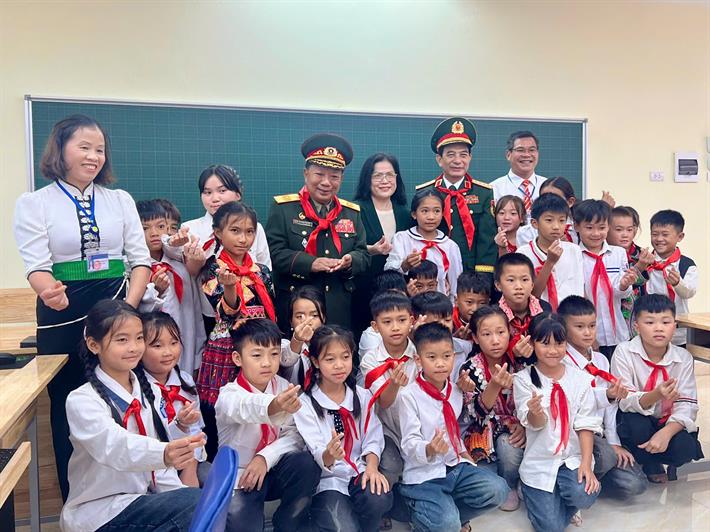 Nhân dịp này, Bộ trưởng Bộ Quốc phòng hai nước đã tặng quà thầy và trò Trường Phổ thông dân tộc bán trú Tiểu học và Trung học cơ sở Lóng Sập.